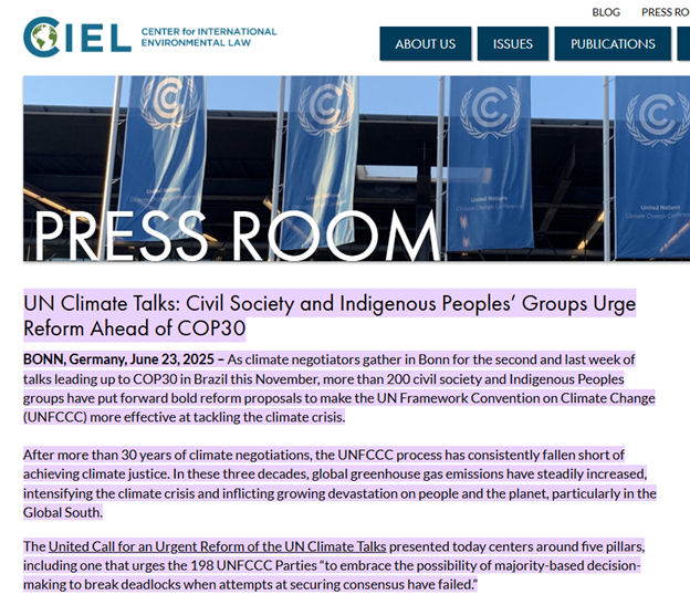 [8] https://www.ciel.org/news/un-climate-talks-bonn-civil-society-urges-reform-ahead-of-cop30/#:~:text=Press%20Room-,UN%20Climate%20Talks:%20Civil%20Society%20and%20Indigenous%20Peoples’%20Groups%20Urge,at%20securing%20consensus%20have%20failed.%E2%80%9D