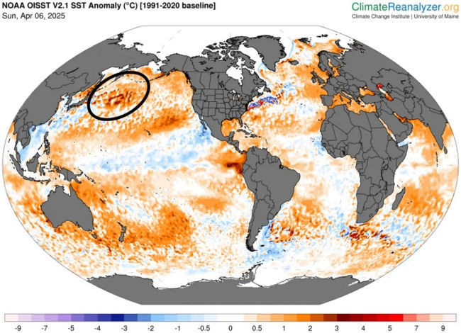 Figure 6. Sea surface temperature anomaly, 4/6/2025. Source: Climate Reanalyzer (4/6/2025). [SST Anomaly]. Climate Change Institute, University of Maine. Retrieved [8/15/2025], from https://climatereanalyzer.org/