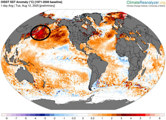 Figure 4. Sea surface temperature anomaly, 8/12/2025. Source: Climate Reanalyzer (8/12/2025). [SST Anomaly]. Climate Change Institute, University of Maine. Retrieved [8/15/2025], from https://climatereanalyzer.org/
